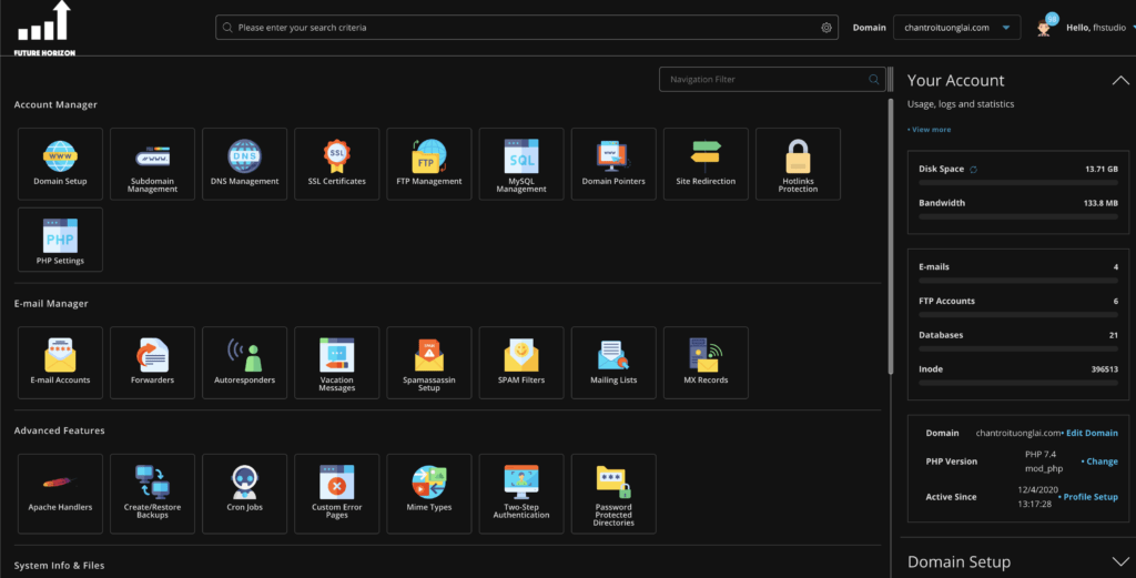 Sau khi bạn thuê hosting, bạn sẽ truy cập vào được khu vực quản lý của hosting đó. Các bạn tham khảo các giao diện Hosting mà Chân Trời Tương Lai đã và đang sử dụng, triển khai cho các khách hàng tại công ty: