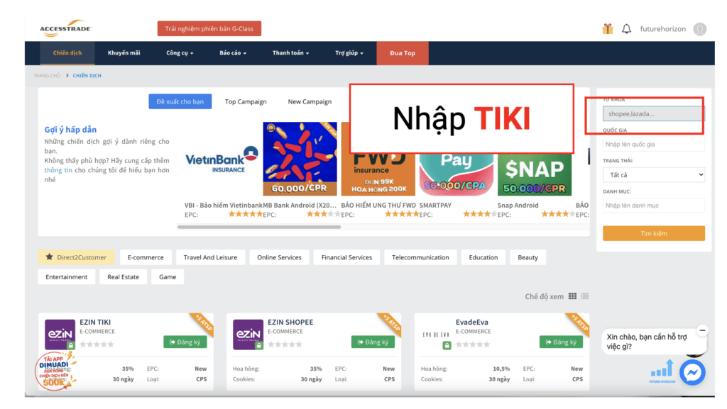 Tại trang Chiến dịch của AccessTrade, các bạn nhập vào “Tiki”