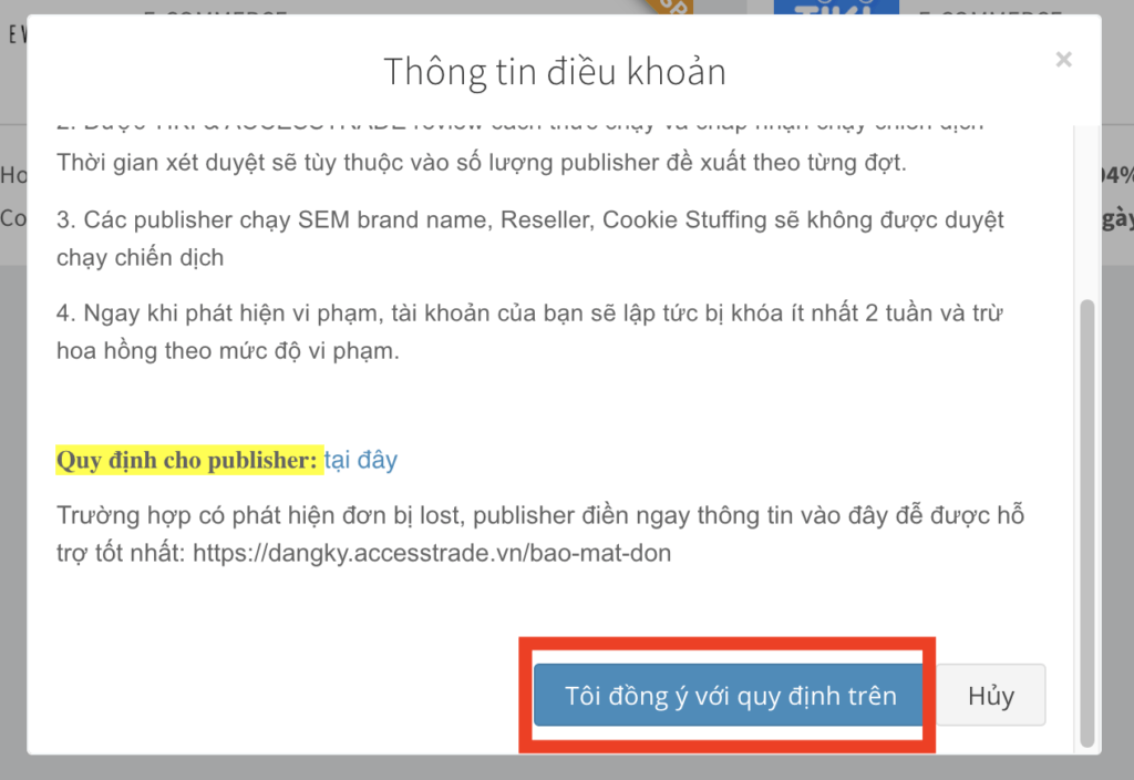 Sau khi ấn đăng ký, các bạn cần chấp nhận các điều khoản khi tham gia vào chương trình tiếp thị liên kết của một thương hiệu, nhãn hàng…